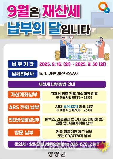 뉴스펀치 김보성 기자 | 양양군은 9월 10일, 2025년도 9월 정기분 재산세 29,799건(총 54억 9,098만 원)을 부과하고 고지서를 발송했다.
