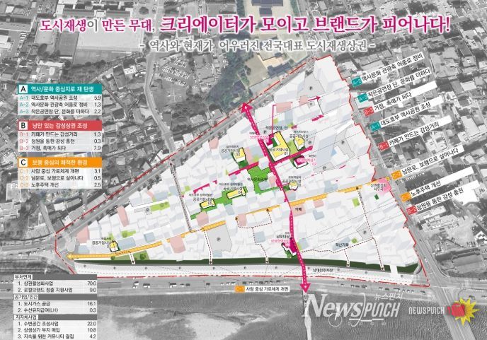 '명주·남문동 도시재생사업'은 총 사업비 382억 원 규모로 △역사문화 자산을 통한 지역 정체성 회복 △감성상권 조성 △보행중심 가로환경 구축을 큰 틀로 하여 S/W적 성격을 띄는 상권활성화사업과 긴밀히 연계하여 ‘역사·문화·상권 융합형 도시재생’을 실현하는 데 중점을 두고 있다.