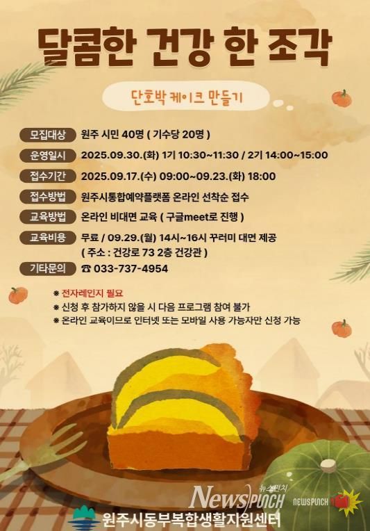 뉴스펀치 김보성 기자 | 원주시 동부복합생활지원센터는 오는 17일부터 ‘달콤한 건강 한 조각’ 단호박 케이크 만들기 참여자를 모집한다.