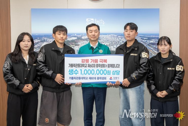 뉴스펀치 김보성 기자 | 가톨릭관동대학교 총학생회(회장 김진훈)는 강릉시가 기록적인 가뭄으로 심각한 물 부족 사태를 겪고 있는 상황에서, 지역사회와 연대를 실천하고자 11일 강릉시에 성금 100만 원 상당의 생수를 기부했다.