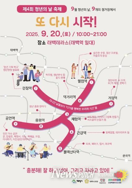 뉴스펀치 김보성 기자 | 태백시는 오는 9월 20일 태백테라스(태백역 일대)에서 ‘또 다시 시작!’ 2025년 청년의 날 행사를 개최한다고 밝혔다.