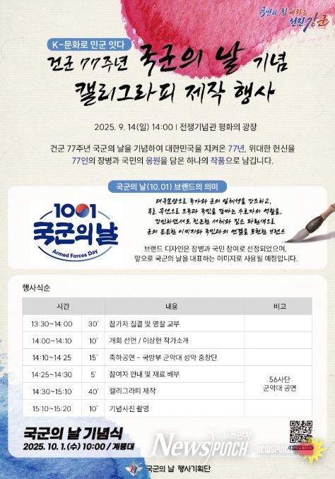 뉴스펀치 김희경 기자 | 건군 77주년 국군의날 행사기획단은 9월 14일 오후 2시, 용산 전쟁기념관 평화의 광장에서 '국군의날 기념 대형 캘리그라피 제작 행사'를 개최한다고 밝혔다.
