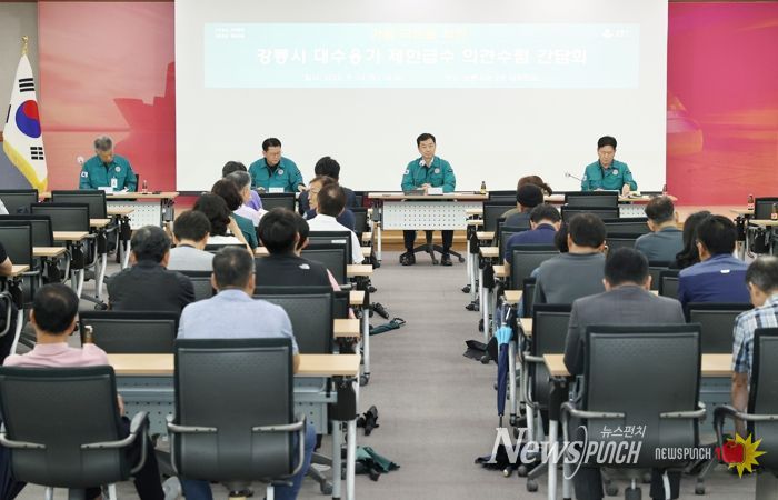 뉴스펀치 김보성 기자 | 강릉시와 아파트 제한급수 관계자들은 13일 시청 2층 대회의실에서 회의를 열고 저수조 100톤 이상 보유 아파트의 제한급수를 오전 6시부터 9시, 오후 6시부터 9시까지 하루 2차례, 각 3시간씩 통일해 시행하기로 의견을 모았다. 개선된 제한급수 방식은 이날 오후부터 적용된다.