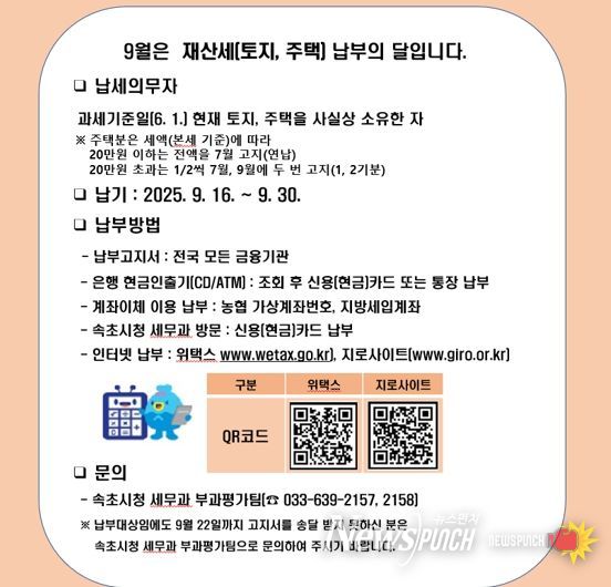 뉴스펀치 김보성 기자 | 속초시는 2025년 6월 1일 기준 관내 토지 및 주택 소유자를 대상으로 2025년도 9월 정기분 재산세 40,894건, 총 125억 7,200만 원을 부과했다.