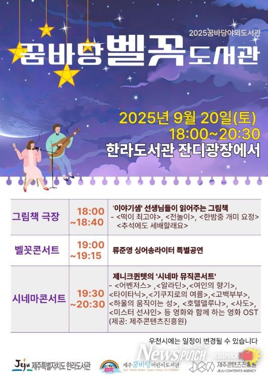 뉴스펀치 천세두 기자 | 제주특별자치도 한라도서관(관장 양애옥)과 제주꿈바당어린이도서관은 20일 오후 6시부터 8시 30분까지 한라도서관 야외잔디마당에서 ‘꿈바당 벨꼿도서관 시네마 콘서트’를 운영한다.