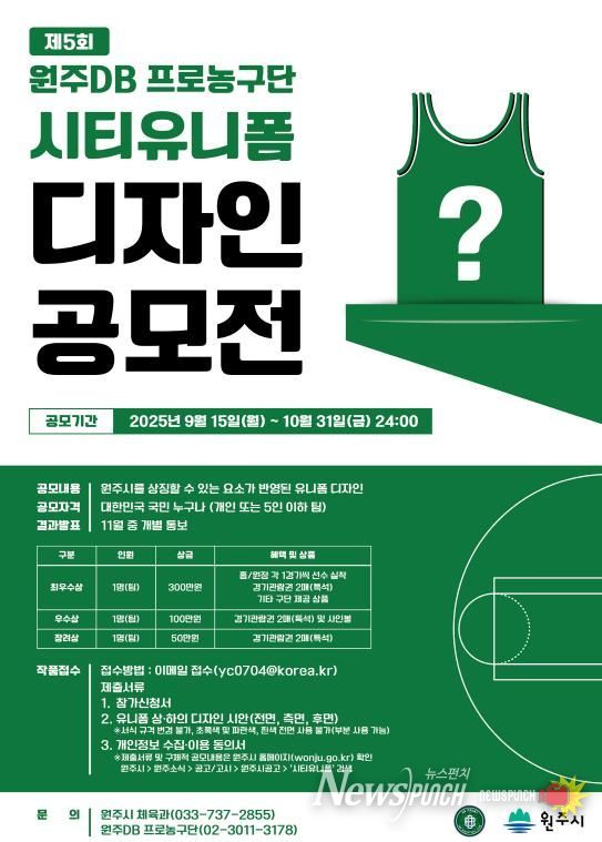 뉴스펀치 김보성 기자 | 원주시는 원주DB 프로농구단과 함께 시 브랜드를 홍보하고, 연고지에 대한 애착을 강화하고자 전 국민을 대상으로 제5회 시티유니폼 공모전을 실시한다.