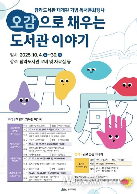 뉴스펀치 천세두 기자 | 제주시 탐라도서관은 오는 9월 24일 재개관을 맞아 시민들을 위한 ‘오감으로 채우는 도서관 이야기’ 프로그램을 운영한다.