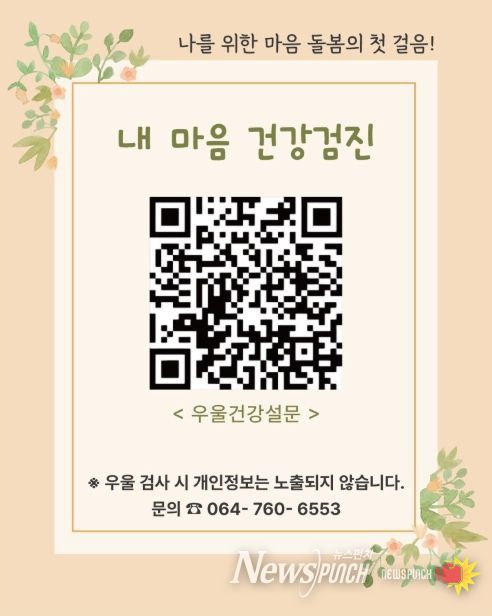 뉴스펀치 천세두 기자 | 서귀포시는 2025년 3월부터 시민들이 언제 어디서나 손쉽게 자신의 정신건강 상태를 확인할 수 있도록 '비대면 QR코드 활용 정신건강 자가 검진'을 운영하고 있다.