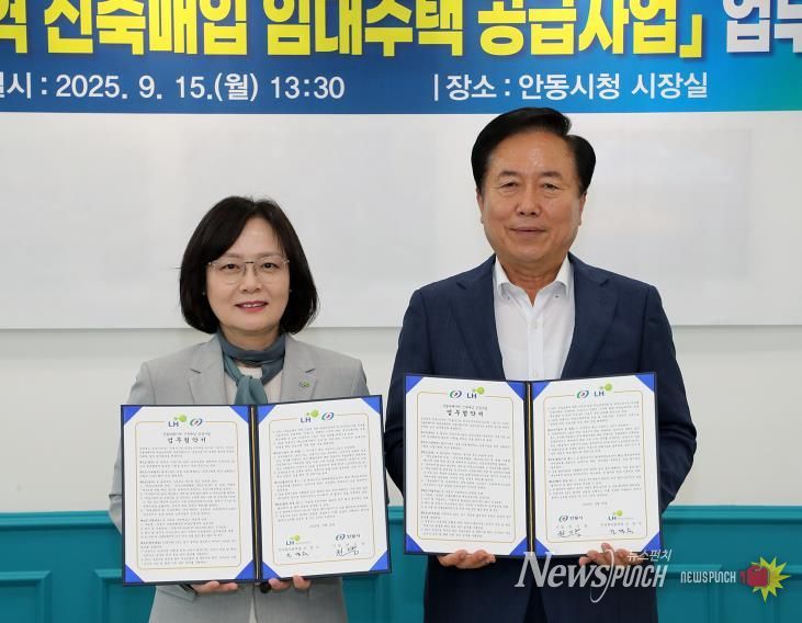 뉴스펀치 김종율 기자 | 안동시와 한국토지주택공사(LH)는 산불피해 이재민의 주거 안정을 위해 '산불피해지역 신축매입 공급사업'에 대한 업무협약을 9월 15일 체결했다.