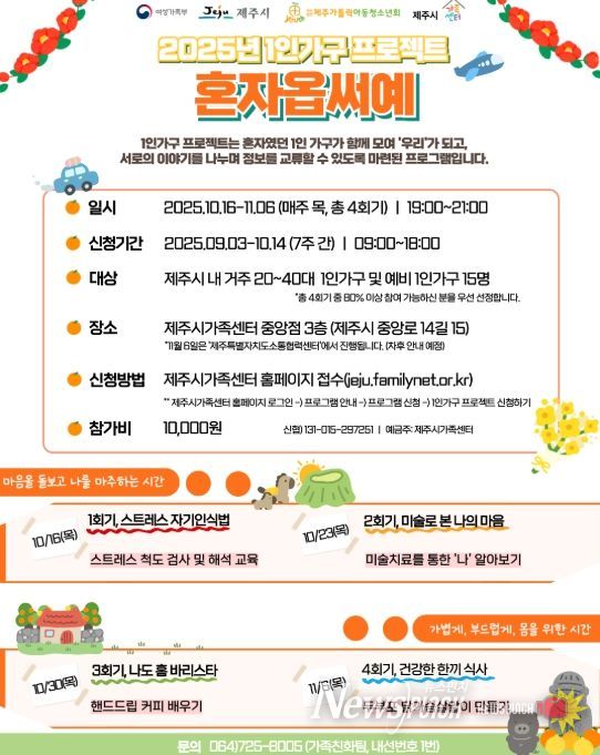 뉴스펀치 천세두 기자 | 제주시는 제주시가족센터와 함께 1인가구의 정서적 고립감 해소와 안정적인 삶의 유지를 위해 오는 10월부터 ‘혼자옵써예’ 프로그램을 운영한다.