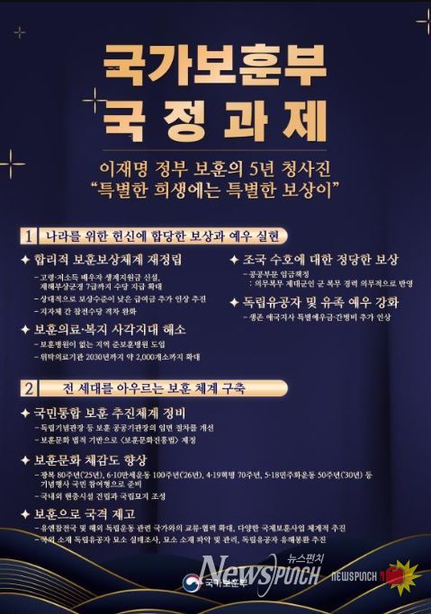 뉴스펀치 김종율 기자 | 국가보훈부는 16일 새정부 국정과제로 '나라를 위한 헌신에 합당한 보상과 예우 실현', '전 세대를 아우르는 보훈 체계 구축'이 확정됐다고 밝혔다.