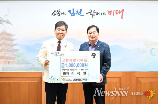 뉴스펀치 김종율 기자 | 국제라이온스클럽 경북지구(총재 조석현)에서는 9월 16일 건전한 기부 문화 조성 및 지역경제 활성화를 위해 조석현 총재가 고향사랑기부금 100만 원을, 여영각 2부총재가 경북사회복지공동모금회 성금 100만 원을 각각 전달했다.