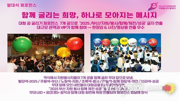 자원봉사자들이 객석에서 7개의 공을 무대 앞으로 굴려 배치하고, 내빈들이 손을 대면 ‘2025 부산 자원봉사 함께 체전 성공’이라는 슬로건이 펼쳐져, 모두가 힘을 모아 성공 체전을 만들어 간다는 상징적 메시지를 전한다.