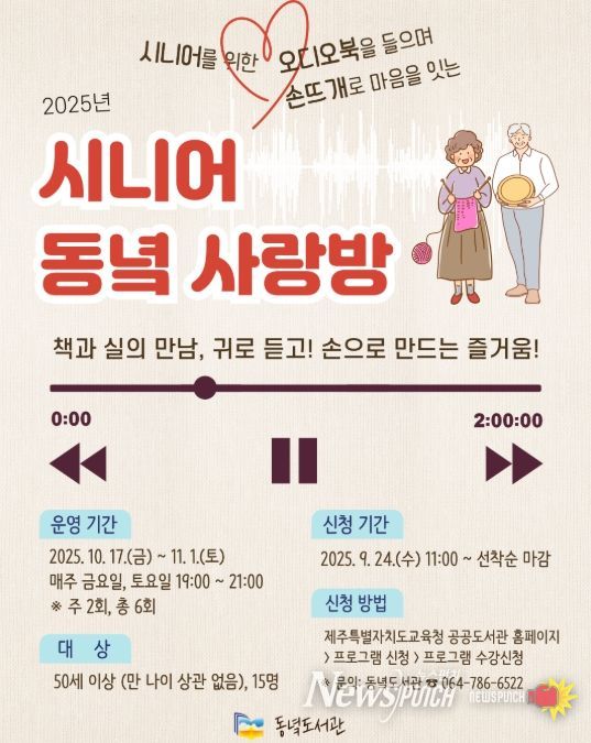 뉴스펀치 천세두 기자 | 제주도교육청 동녘도서관은 10월 17일부터 오는 11월 1일까지 시니어들의 건강한 여가 활동과 문화 향유를 지원하기 위한 ‘2025년 시니어 동녘 사랑방’ 프로그램을 운영한다.
