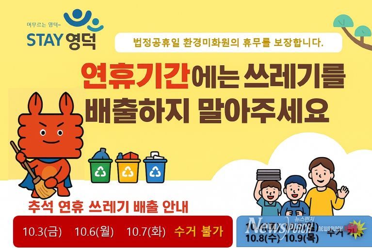 뉴스펀치 김종율 기자 | 영덕군은 환경미화원의 휴무를 보장하고 업무 능률을 높이기 위해 추석 연휴 기간인 다음 달 3, 6, 7일 사흘간 쓰레기 수거 업무를 일시적으로 중단한다.