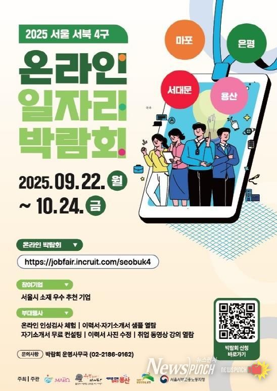 뉴스펀치 김완규 기자 | 서울 은평구는 오는 22일부터 내달 24일까지 ‘2025 서울 서북 4구 온라인 일자리 박람회’를 개최한다고 밝혔다.