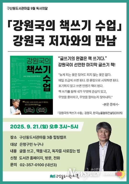 뉴스펀치 김완규 기자 | 서울 은평구는 구산동도서관마을에서 오는 21일 오후 3시에 ‘강원국의 책쓰기 수업’ 강원국 저자와의 만남을 개최한다고 밝혔다.