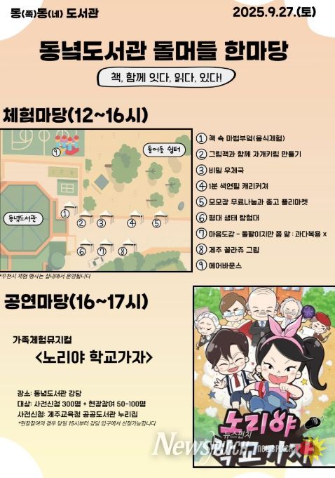 뉴스펀치 천세두 기자 | 제주도교육청 동녘도서관은 조천읍도서관과 함께 오는 27일 낮 12시부터 오후 5시까지 동녘도서관에서 지역 주민을 대상으로 ‘돌머들 한마당’ 행사를 개최한다.