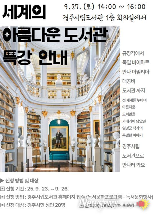 뉴스펀치 김종율 기자 | 경주시립도서관은 오는 23일부터 다음달 19일까지 성공적인 2025 APEC 정상회의 개최를 기원하며 임영균 작가의 사진전 ‘세계의 아름다운 도서관’을 연다고 18일 밝혔다.