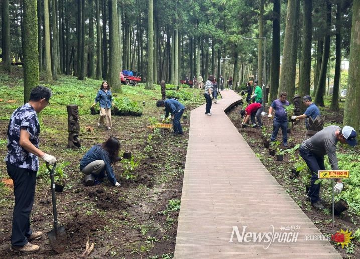 뉴스펀치 천세두 기자 | 제주시 절물생태관리소는 16일 절물자연휴양림에서 ‘수국 식재 행사’를 개최했다.