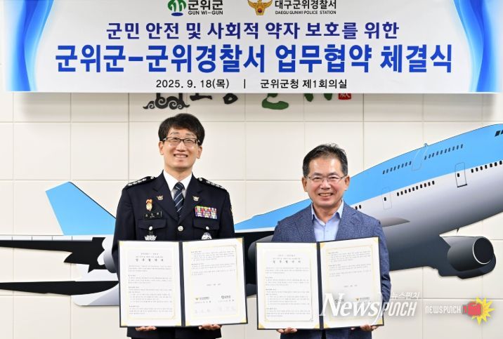 뉴스펀치 김종율 기자 | 군위군과 군위경찰서는 9월 18일 군위군청에서 군민 안전 및 사회적 약자 보호를 위한 업무협약을 체결하고, 보다 안전한 지역사회 조성을 위해 상호 협력해 나가기로 했다.