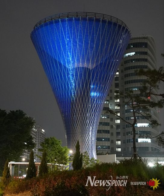 32m 높이의 정수탑 외부를 감싼 '비의 장막(Rain Veil)'은, 33만여 개의 친환경 바이오 소재가 바람과 햇살에 반응하며 낮에는 물결 같은 빛의 파동을, 밤에는 아름다운 조명과 어우러진 환상적인 경관을 연출한다.