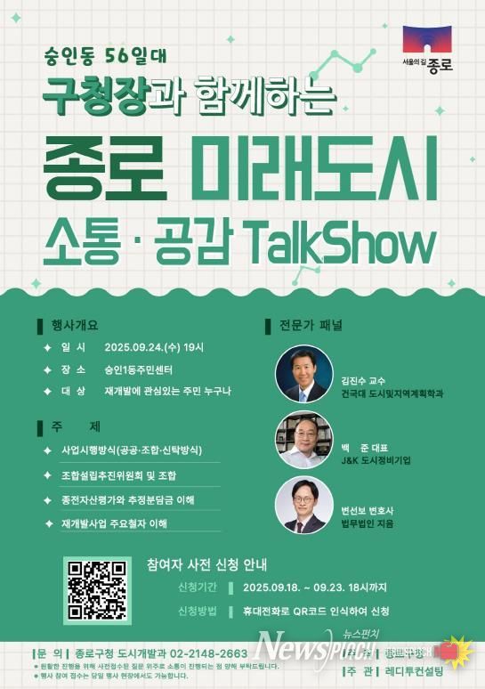 토크쇼는 4개 구역에서 순차적으로 열린다. 23일 19시 종로구민회관 창신아트홀에서는 ‘창신동 23-606 일대’에서 진행하는 재개발사업을 논한다. 24일 19시 숭인1동 주민센터 5층 강당에서는 숭인동 56 일대를, 26일 19시 종로구민회관 창신아트홀에서는 창신동 629 일대를, 30일 19시 종로문화체육센터에서는 행촌동 210-2 일대 재개발사업을 각각 설명한다.