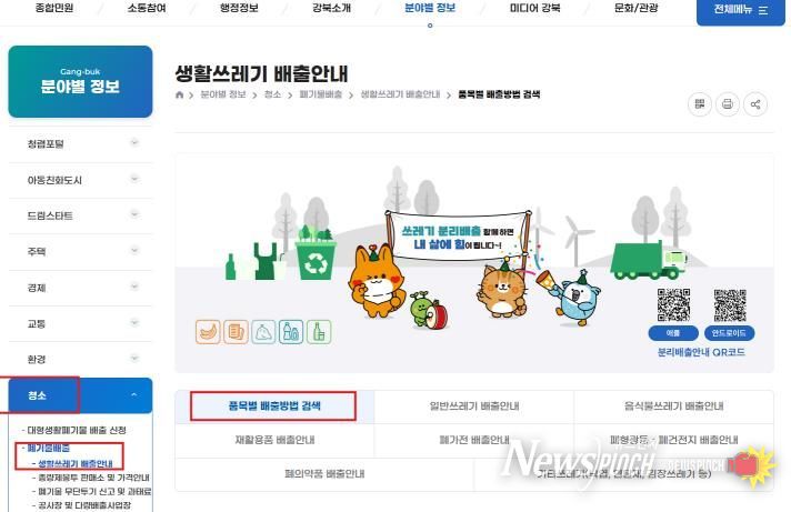 뉴스펀치 김완규 기자 | 서울 강북구는 생활폐기물의 올바른 분리배출을 돕기 위해 구청 홈페이지에 ‘청소’ 메뉴를 신설하고, 주민 맞춤형 폐기물 분리배출 안내시스템을 운영한다고 밝혔다. 주요 기능은 품목별 검색으로, 9월 시범운영을 거쳐 10월부터 정식 운영에 들어간다.
