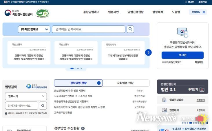 뉴스펀치 김종율 기자 | 법제처는 9월 19일, 국민이 입법추진 현황 등 정부입법 관련 정보를 보다 쉽고 편리하게 확인할 수 있도록 기존 국민참여입법센터를 전면 개편하고, 정부입법지원센터를 ‘국민참여입법센터’로 통합하여 새롭게 서비스를 시작한다.