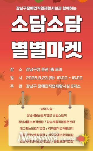 뉴스펀치 김완규 기자 | 꿈이 모이는 도시, 미래를 그리는 강남구가 9월 23일 오전 10시부터 오후 4시까지 구청 본관 1층에서 장애인생산품 특별판매·홍보전 ‘소담소담 별별마켓’을 개최한다.