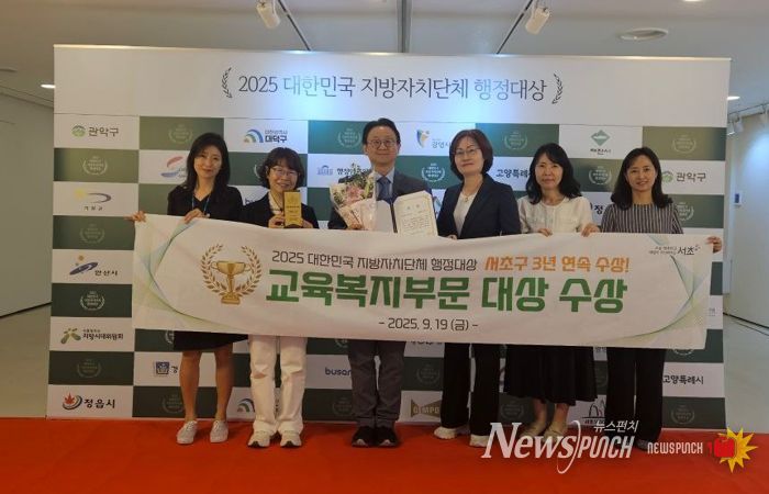 뉴스펀치 김완규 기자 | 서울 서초구가 지난 19일 이데일리(주)가 주최하고 행정안전부, 대한민국시장군수구청장협의회 등 유관기관이 후원한 '2025 대한민국 지방자치단체 행정대상'에서 교육·복지 분야 대상을 수상했다고 밝혔다.