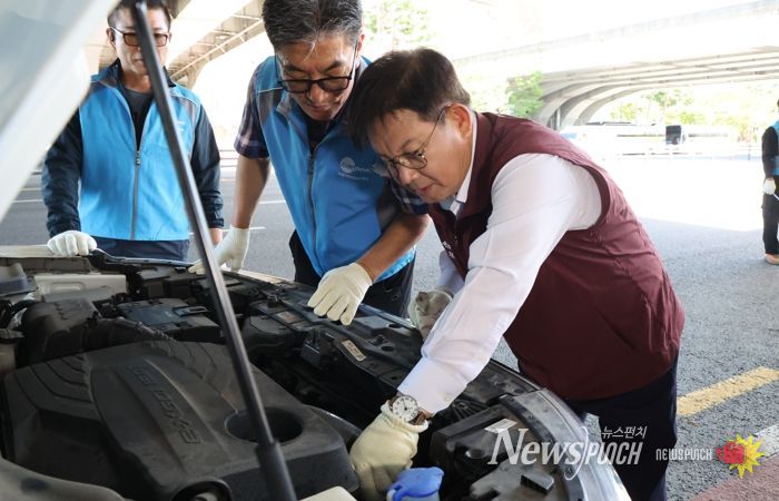 뉴스펀치 김완규 기자 | 박강수 마포구청장은 9월 21일 오전, 월드컵경기장 남문 맞은편에서 열린 자동차 무상점검 현장을 방문했다.