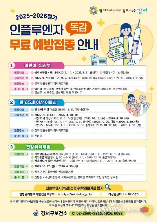 뉴스펀치 김완규 기자 | 서울 강서구가 오는 9월 22일부터 내년 4월 30일까지 인플루엔자 백신 무료 예방접종을 실시한다고 밝혔다.