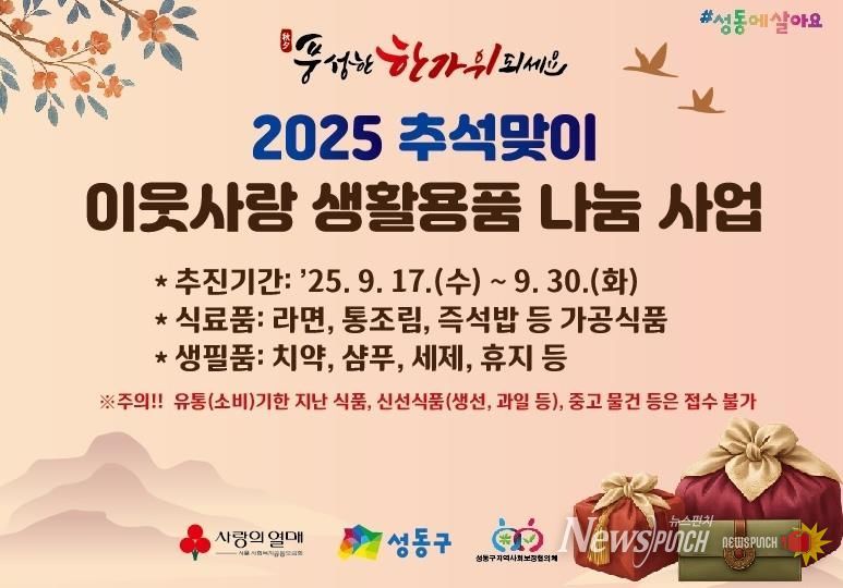 뉴스펀치 김완규 기자 | 서울 성동구는 소외된 이웃 없이 모두가 훈훈한 추석 명절을 보낼 수 있도록 생활용품 및 식료품을 기부받아 어려운 이웃에게 전달하는 ‘추석맞이 이웃사랑 생활용품 나눔 사업’을 오는 9월 30일까지 추진한다고 밝혔다.