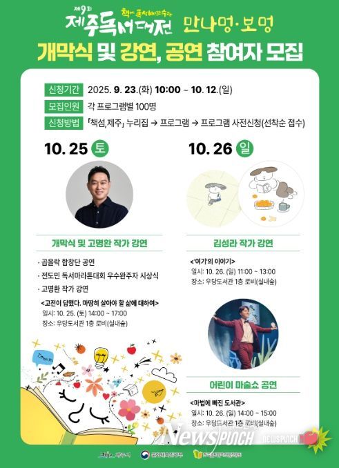 뉴스펀치 천세두 기자 | 제주시 우당도서관은 10월 24일부터 26일까지 ‘책에 폭삭 빠졋수다’를 주제로 개최되는 ‘제9회 제주독서대전’의 프로그램별 참여자를 선착순 모집한다.