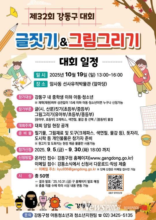 뉴스펀치 김완규 기자 | 강동구는 오는 10월 19일 암사동 선사유적박물관에서 '제32회 강동구 아동·청소년 글짓기 및 그림그리기 대회'를 개최한다고 밝혔다.