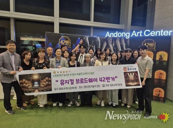 뉴스펀치 김종율 기자 | 경상북도봉화교육지원청은 9월 19일, 2025 농어촌 우리동네 예술학교 운영 관리자 및 담당 교사들이 안동문화예술의전당에서 열린 뮤지컬 『브로드웨이 42번가』 공연을 관람했다고 밝혔다.