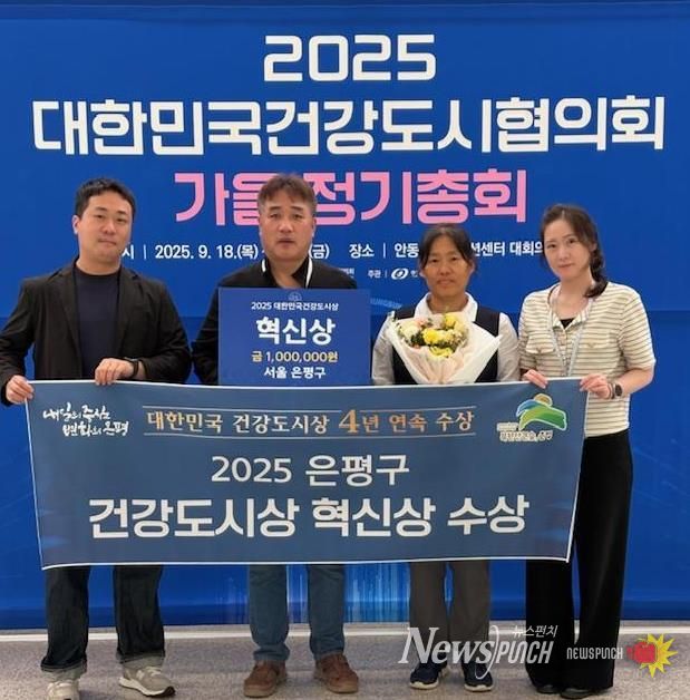 뉴스펀치 김완규 기자 | 서울 은평구는 지난 18일 안동에서 열린 ‘2025 제10회 대한민국 건강도시상 공모전’에서 혁신상을 받았다고 밝혔다.