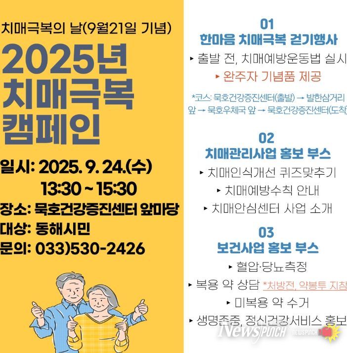 뉴스펀치 김보성 기자 | 동해시는 2025년 치매극복의 날(9월 21일)을 맞아 치매에 대한 인식개선과 예방·관리의 중요성을 널리 알리기 위해 오는 9월 24일 오후 1시 30분 묵호건강증진센터 앞마당에서 기념 캠페인을 개최한다.