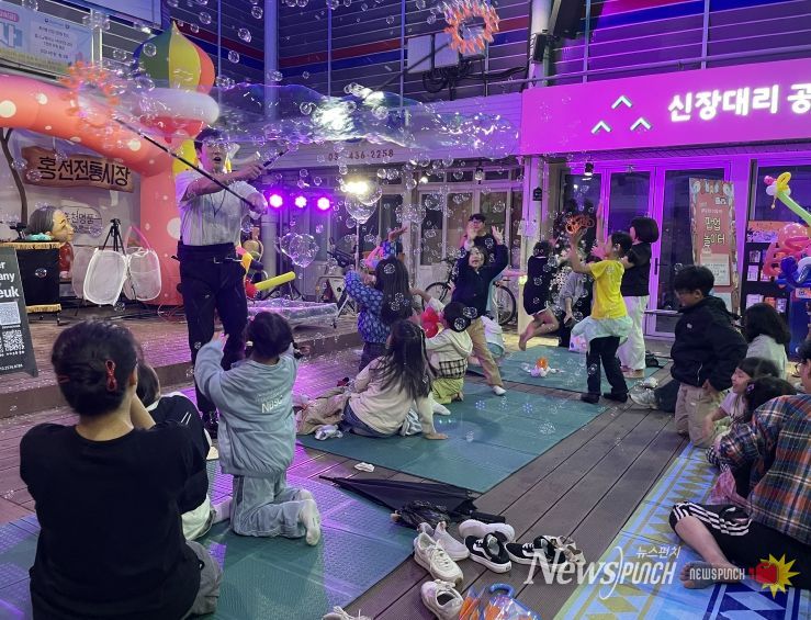 뉴스펀치 김보성 기자 | 홍천군은 9월 19일 오후 6시 30분부터 7시 30분까지, 우천으로 인해 당초 예정된 꽃뫼공원에서 홍천 전통시장 중앙광장으로 장소를 변경하여 ‘팝업 놀이터 버블쇼’를 개최했다.