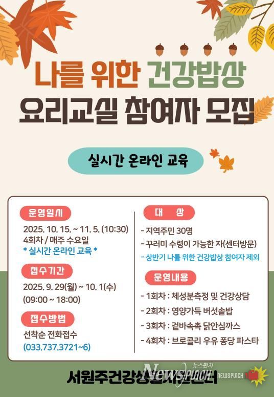 뉴스펀치 김보성 기자 | 서원주건강생활지원센터는 지역 주민의 올바른 식습관 형성과 대사증후군 예방·관리를 돕기 위해 ‘나를 위한 건강밥상 요리교실’ 프로그램 참여자를 모집한다.