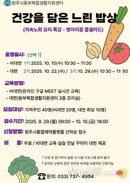 뉴스펀치 김보성 기자 | 원주시동부복합생활지원센터는 오는 29일부터 저속노화 요리 특강 ‘건강을 담은 느린 밥상’ 프로그램 참여자를 모집한다.
