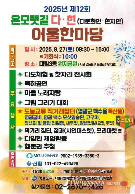 뉴스펀치 김완규 기자 | 영등포구가 오는 9월 27일, 대림동 일대에서 두 개의 마을축제를 동시 개최한다고 밝혔다. 행사는 각각 ‘대림 어린이공원(대림1동)’과 ‘원지 어린이공원(대림3동)’에서 열리며, 지역 특색을 살린 프로그램으로 주민 화합과 교류의 장을 마련한다.