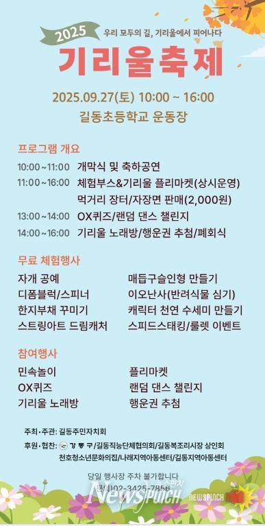 뉴스펀치 김완규 기자 | 강동구 길동은 오는 27일 10시부터 16시까지 길동초등학교 운동장에서 주민 화합을 위한 ‘2025 기리울 축제’가 열린다고 밝혔다.