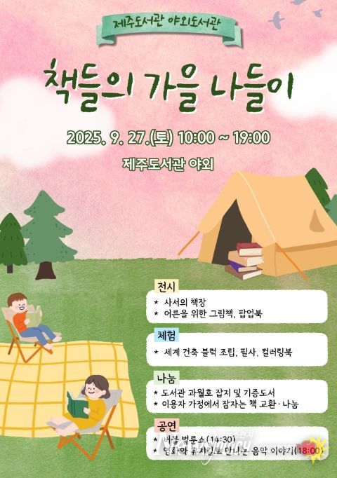 뉴스펀치 천세두 기자 | 제주도교육청 제주도서관은 도민들이 책과 문화를 함께 즐길 수 있도록 오는 27일 오전 10시부터 오후 7시까지 도서관 야외 마당에서 야외도서관 ‘책들의 가을 나들이’를 개최한다.