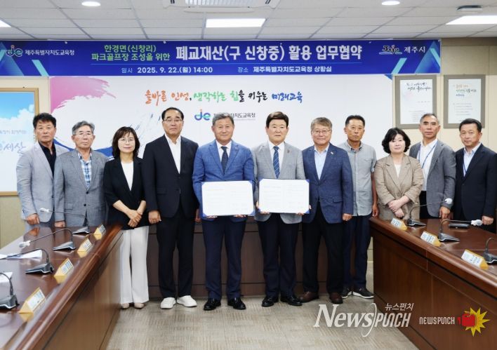 뉴스펀치 천세두 기자 | 제주시와 제주특별자치도교육청은 9월 22일 오후 2시 도교육청에서 한경면 구 신창중학교 부지를 활용한 파크골프장 조성을 위해 업무협약을 체결했다.