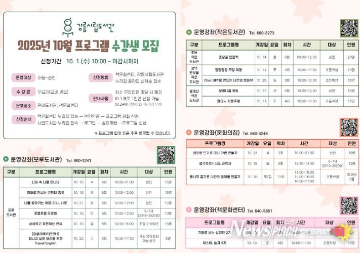 뉴스펀치 김보성 기자 | 강릉시립도서관은 오는 10월 1일부터 '2025년 10월 프로그램'에 참여할 수강생을 모집한다.