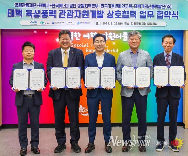 뉴스펀치 김보성 기자 | 강원관광재단은 지난 9월 23일 태백시, 한국에너지공단 강원지역본부, 한국기후변화연구원, 태백가덕산풍력발전㈜과 함께 ‘육상풍력 관광자원 개발을 위한 상호 협력 협약’을 체결하고 폐광지역 관광의 새로운 미래를 열겠다고 밝혔다.