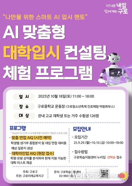 뉴스펀치 김완규 기자 | 구로구가 10월 18일 오전 11시부터 구로중학교 운동장에서 AI와 함께하는 대학 입시 상담(컨설팅)을 개최한다고 밝혔다.