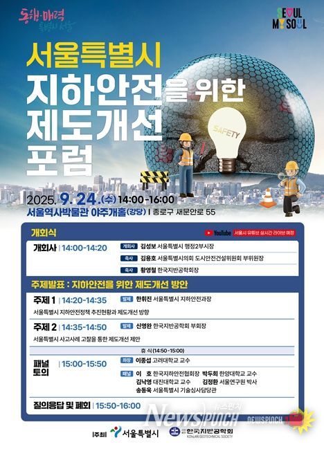 뉴스펀치 김완규 기자 | 지반침하 예방과 지하 안전관리에 대한 사회적 관심이 높아진 가운데, 서울시가 24일 오후 2시 서울역사박물관(종로구 새문안로 55) 1층 야주개홀에서 ‘지하안전을 위한 제도 개선 포럼’을 개최한다.